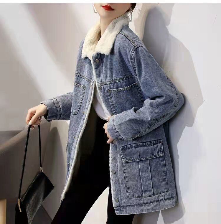 送料無料 ミッドレングスの冬のフリースデニムコートラペルベルベットライナージーンズジャケット女性ストリート暖かいパッド入り緩い Jaqueta ウィンター 冬物 AE3356589870325610