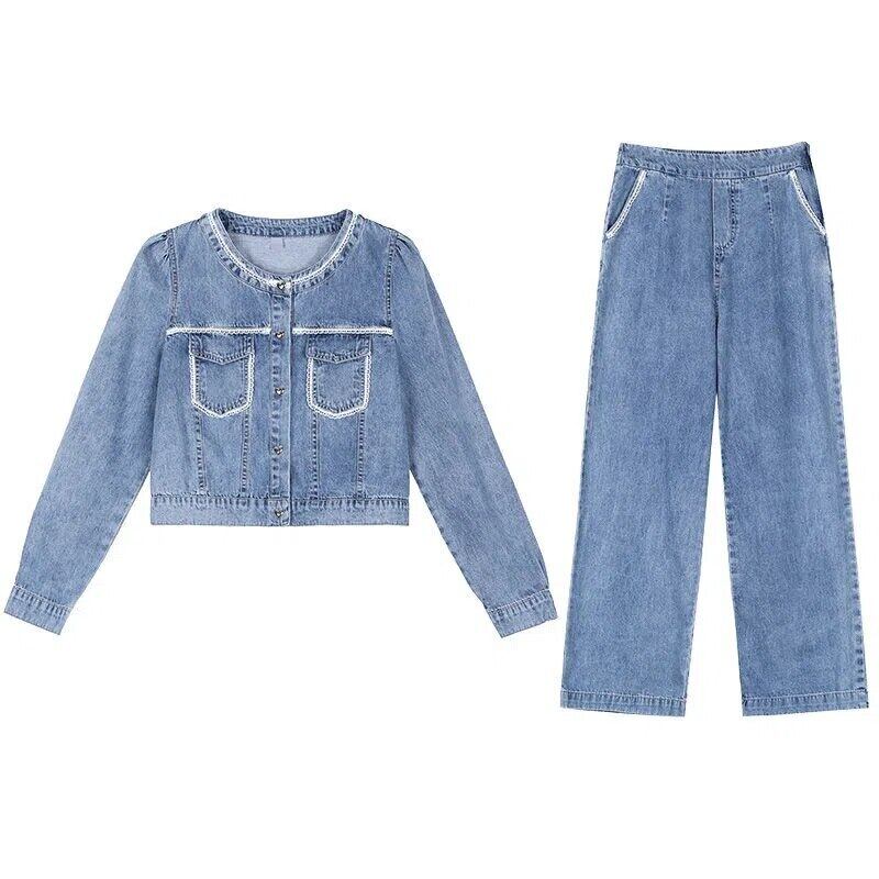 送料無料 ラウンドカラーデニムスーツワイドレッグジーンズツーピースセット女性クロップジーンズジャケットウエストバギーパンツ ワイドパンツ AE3356573685966661