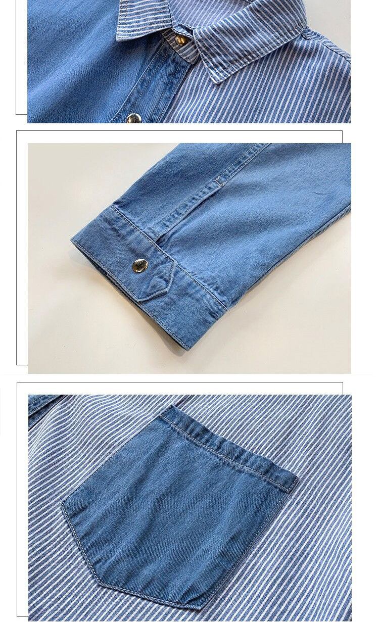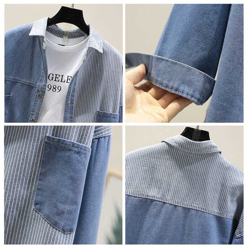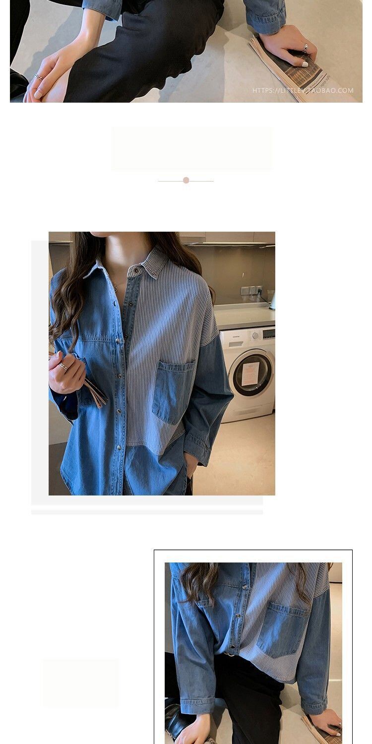 送料無料 ストライプパッチワークデニムシャツ女性 2022 春ルーズブラウスラペルシングルブレストジーンズ スプリング 春物 AE3356565299102267