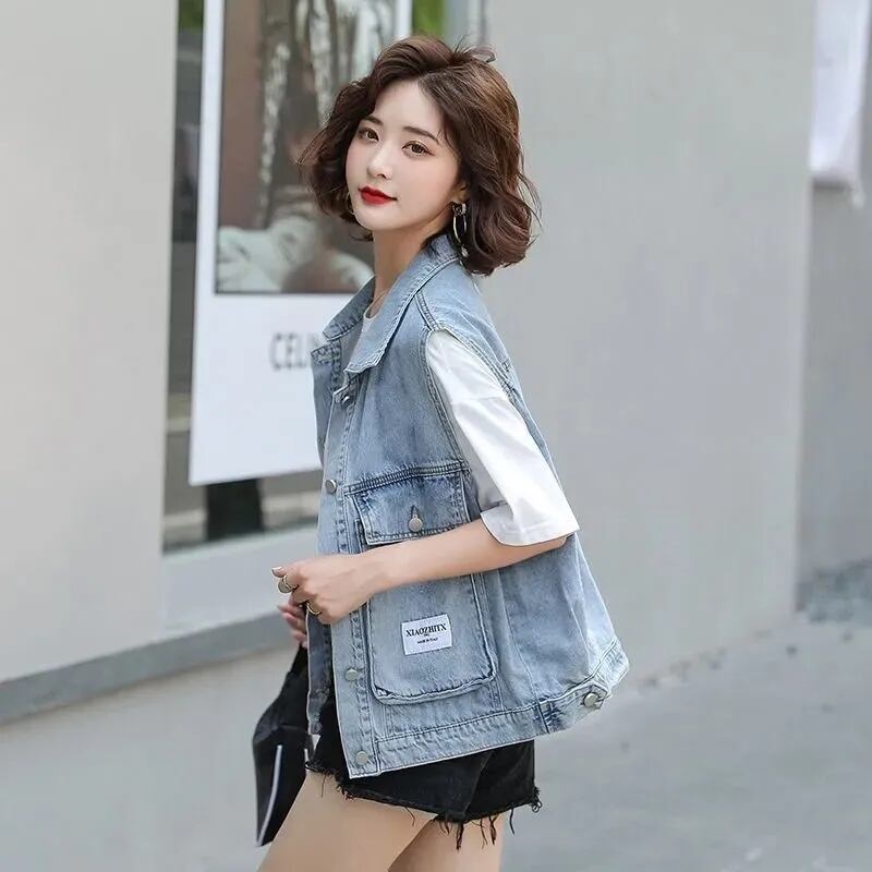 送料無料 グレーブラックデニムベスト女性ストリート漂白ルーズノースリーブジャケットビッグポケット Chaleco ボーイフレンドスタイル Weste AE3356522843112938