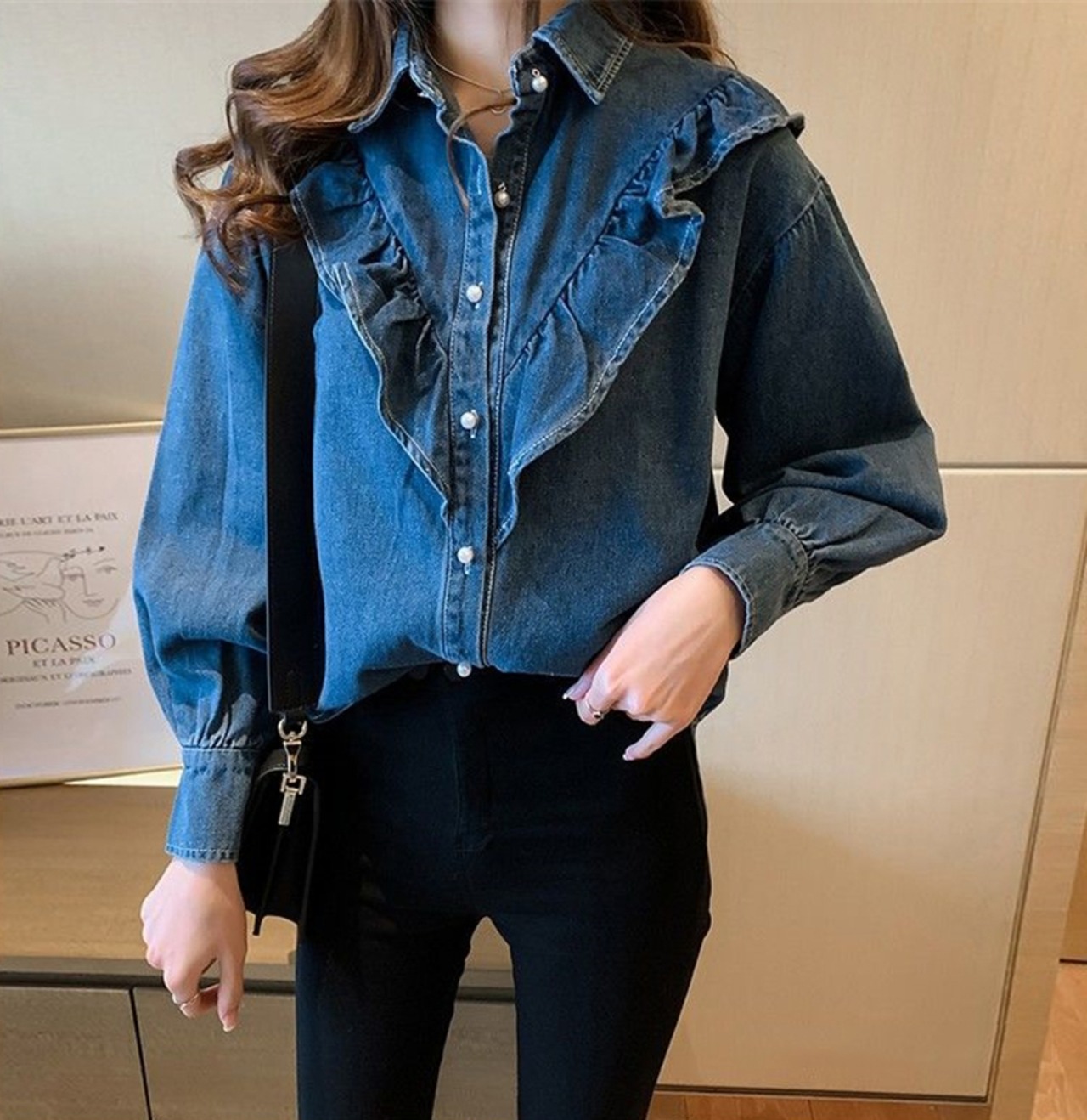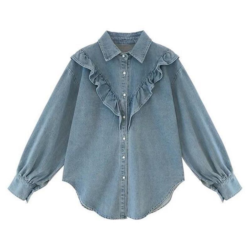 送料無料 フリル デニム ブラウス女性ラペル特大 4Xl ジーンズ シャツ春トップス シングルブレスト カミーサ Vaquera スプリング 春物 AE3356545998801999
