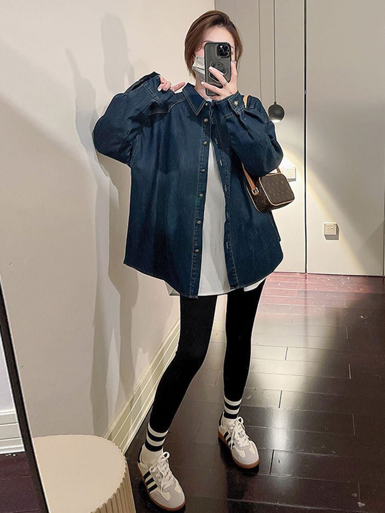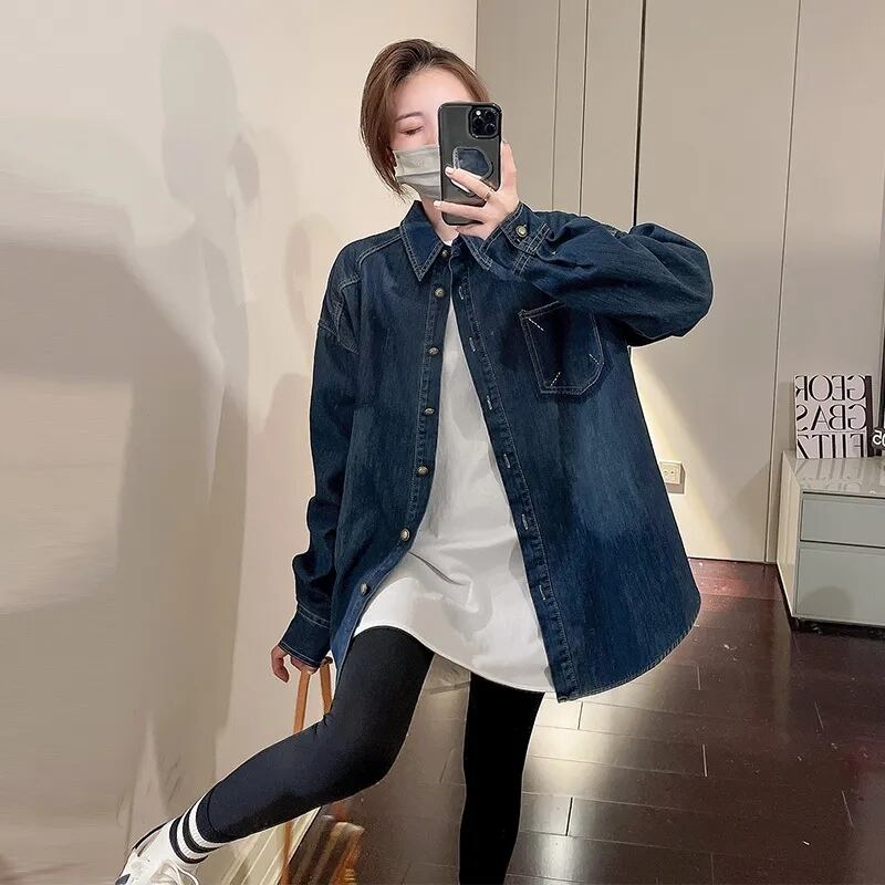 送料無料 ボーイフレンドスタイルデニムシャツ春秋の女性ヴィンテージブラウス長袖ジーンズトップスシングルブレスト ロング スプリング 春物 オータム 秋物 ビンテージ AE3356567455534177