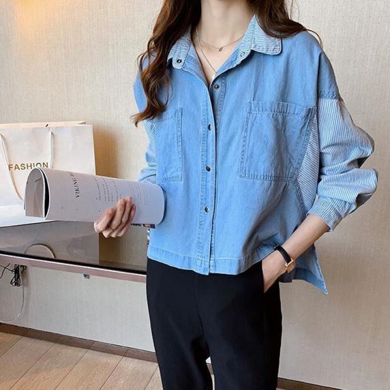 送料無料 パッチワーク ストライプ デニム ブラウス ルーズ ジーンズ シャツ女性オーバーサイズ ラペル ショート スプリング トップ 春物 AE3356532865228579
