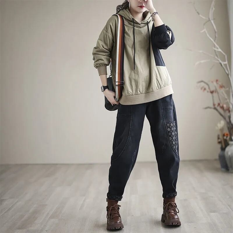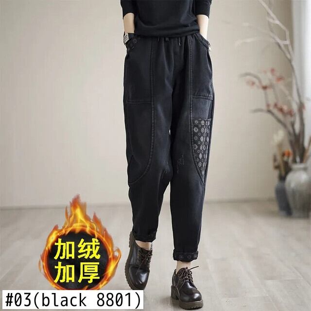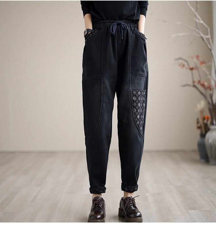 送料無料 弾性ウエスト巾着暖かいジーンズ女性緩いパッチワークフリースハーレム Vaqueros 足首の長さ BF プラスベルベットデニムパンツ エラスティック 伸縮 AE3356546955799281