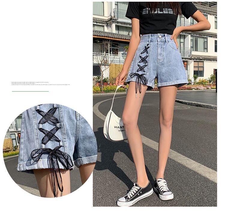 送料無料 シックなレースアップショーツジーンズ女性 2022 夏の袖口ウエスト Vaqueros Cortos ワイドレッグデニムショーツ サマー 夏物 ブルマー ワイドパンツ AE3356513863039856