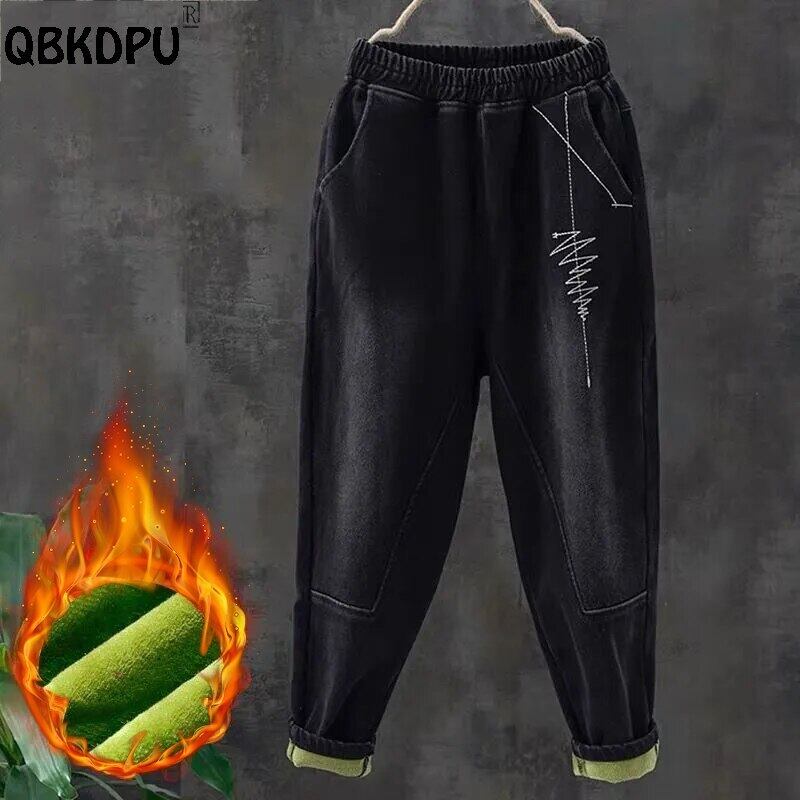 送料無料 プラスベルベットだぶだぶヴィンテージ暖かいジーンズの女性の冬の弾性ウエストハーレム Vaqueros 漂白刺繍フリースデニムパンツ エラスティック 伸縮 ウィンター 冬物 ビンテージ AE3356561163770100