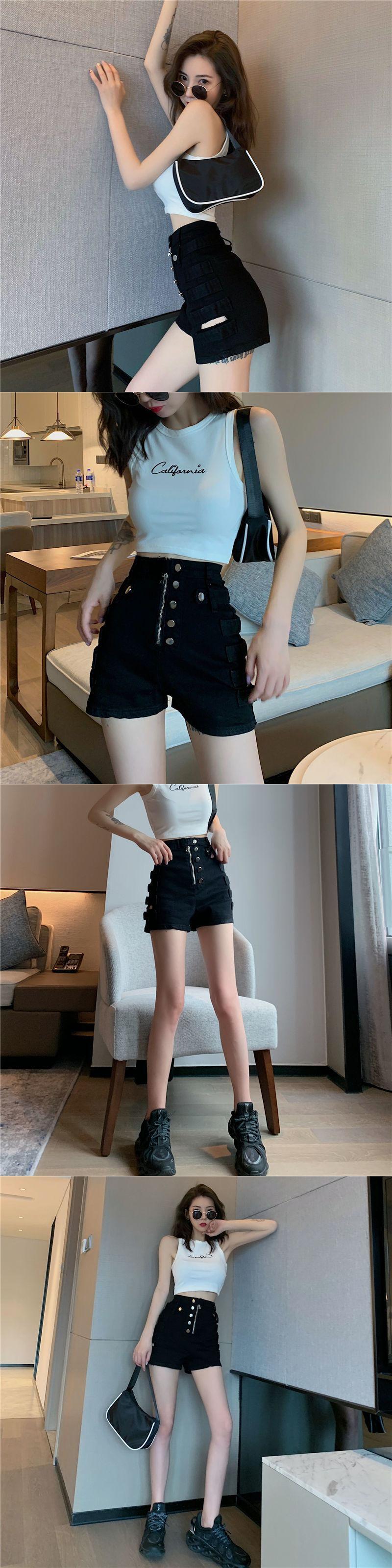 送料無料 ストリート中空アウトジーンズショーツ女性ウエストロックパンクスタイル黒ショート Vaqueros 2023 夏のシックなデニムパンツ ブラック サマー 夏物 ブルマー AE3356531518016229