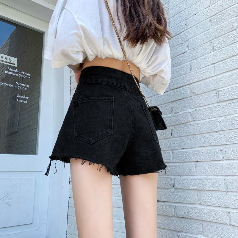 送料無料 女性のほつれた A ライン ショーツ ジーンズ黒ボタン ウエスト セクシーなショート デニム パンツ 2022 夏ホット Vaqueros Cortos ブラック サマー 夏物 ブルマー Aライン AE3356589952700434