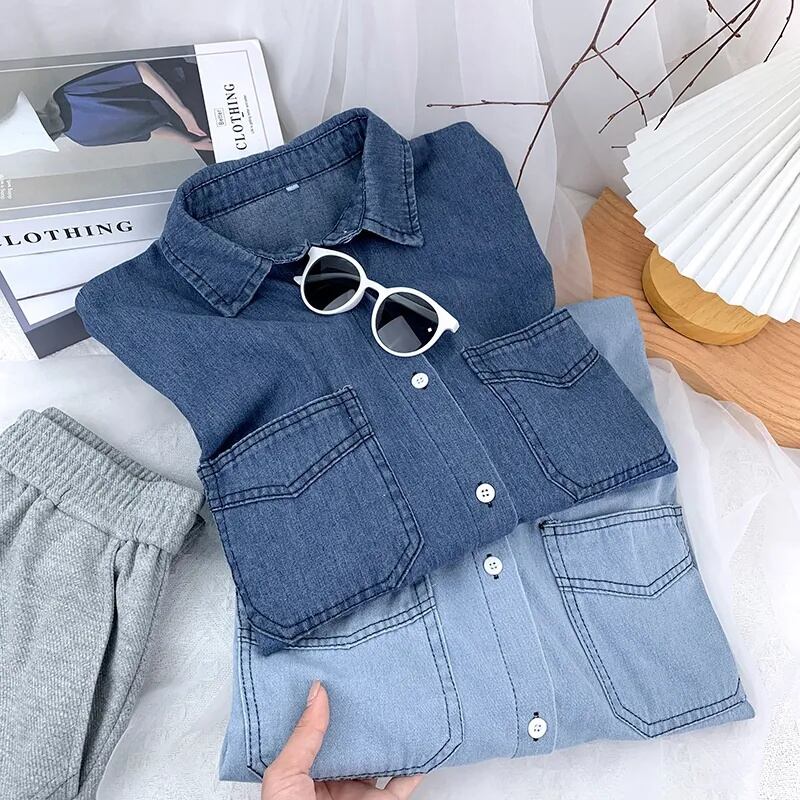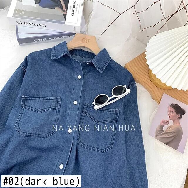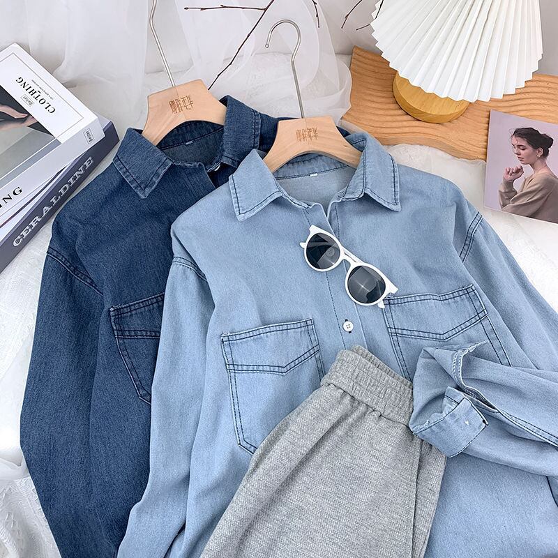 送料無料 ポケットルーズデニムシャツ女性の基本的なポロ襟ジーンズブラウス長袖春トップス無地シングルブレスト ロング スプリング 春物 ソリッドカラー AE335658519682271