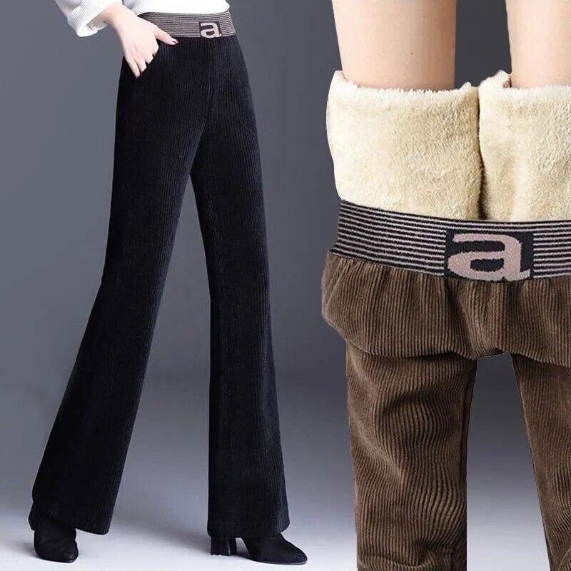 送料無料 女性厚いフェイクカシミヤフレアパンツコーデュロイ冬パンツパッチワーク暖かいワイドレッグパンツ緩い弾性ウエストのズボン エラスティック 伸縮 ウィンター 冬物 ファー ワイドパンツ AE3356555187299236