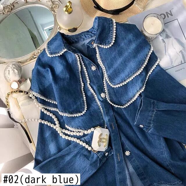 送料無料 フレンチスタイルの人形の襟デニムブラウス女性ヴィンテージルーズパールジーンズシャツ春トップス長袖かわいい ロング 大人ガーリー スウィート キュート カジュアル スプリング 春物 真珠 ビンテージ AE3356578907724751
