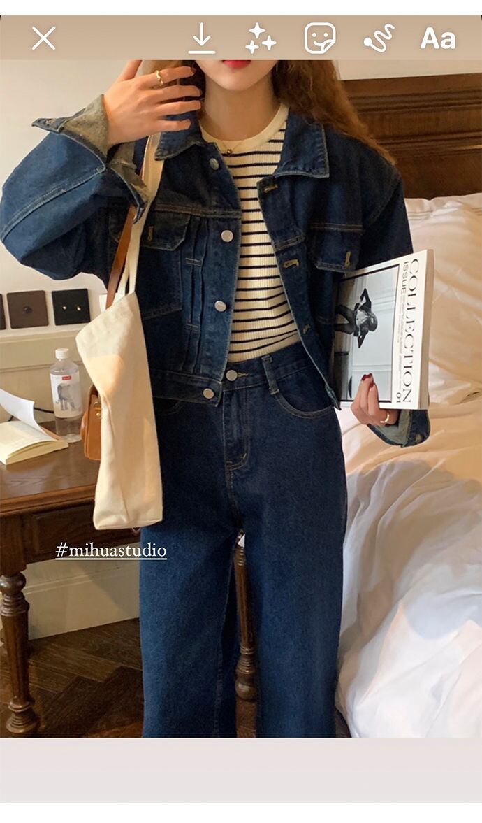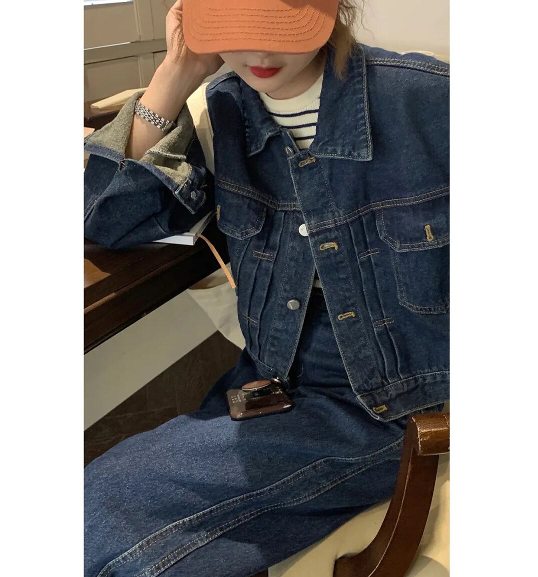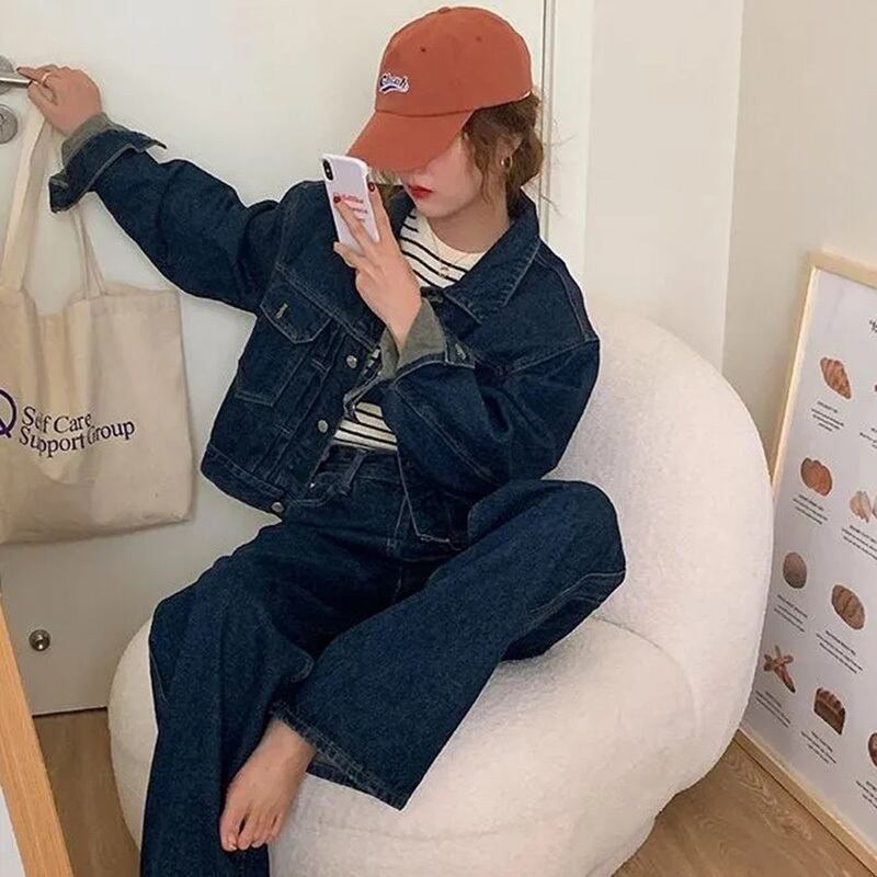 送料無料 デニムツーピースセットレディース衣装ストリート春クロップカウボーイジャケット+だぶだぶのジーンズクリックブルーパンツスーツ スプリング 春物 AE3356544372805742