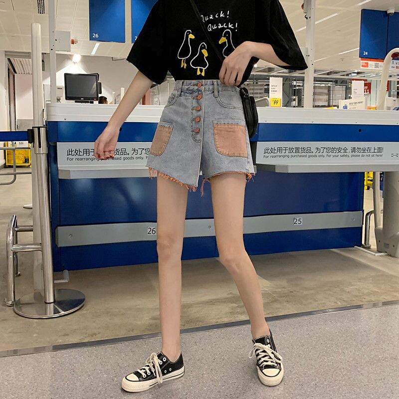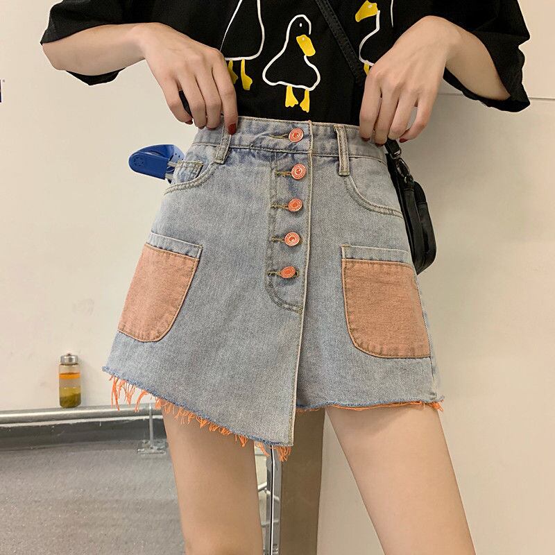 送料無料 シックなジーンズショーツスカート女性の夏のシングルブレストデニムショーツパッチワークウエスト Vaqueros Cortos サマー 夏物 ブルマー AE3356519366808261