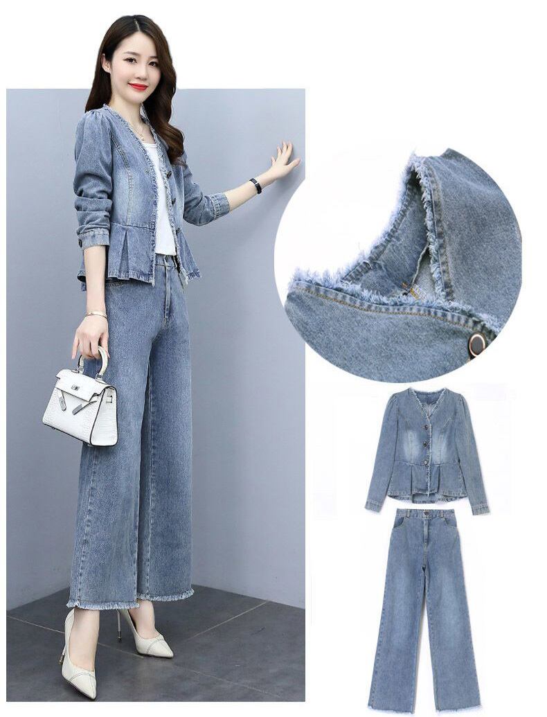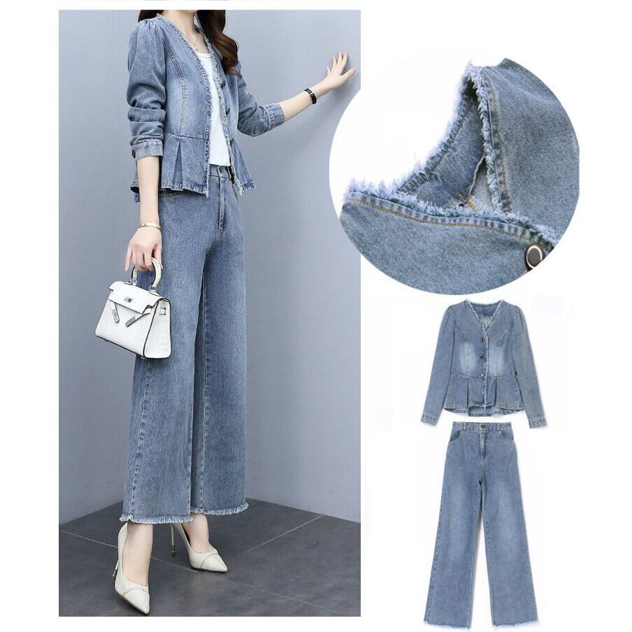 送料無料 春ジーンズツーピースセット女性シックな電話 V ネックデニムジャケット弾性ウエストだぶだぶのジーンズオフィス特大パンツスーツ エラスティック 伸縮 スプリング 春物 Vネック 会社 学校 通勤や通学にも AE3356543584494508