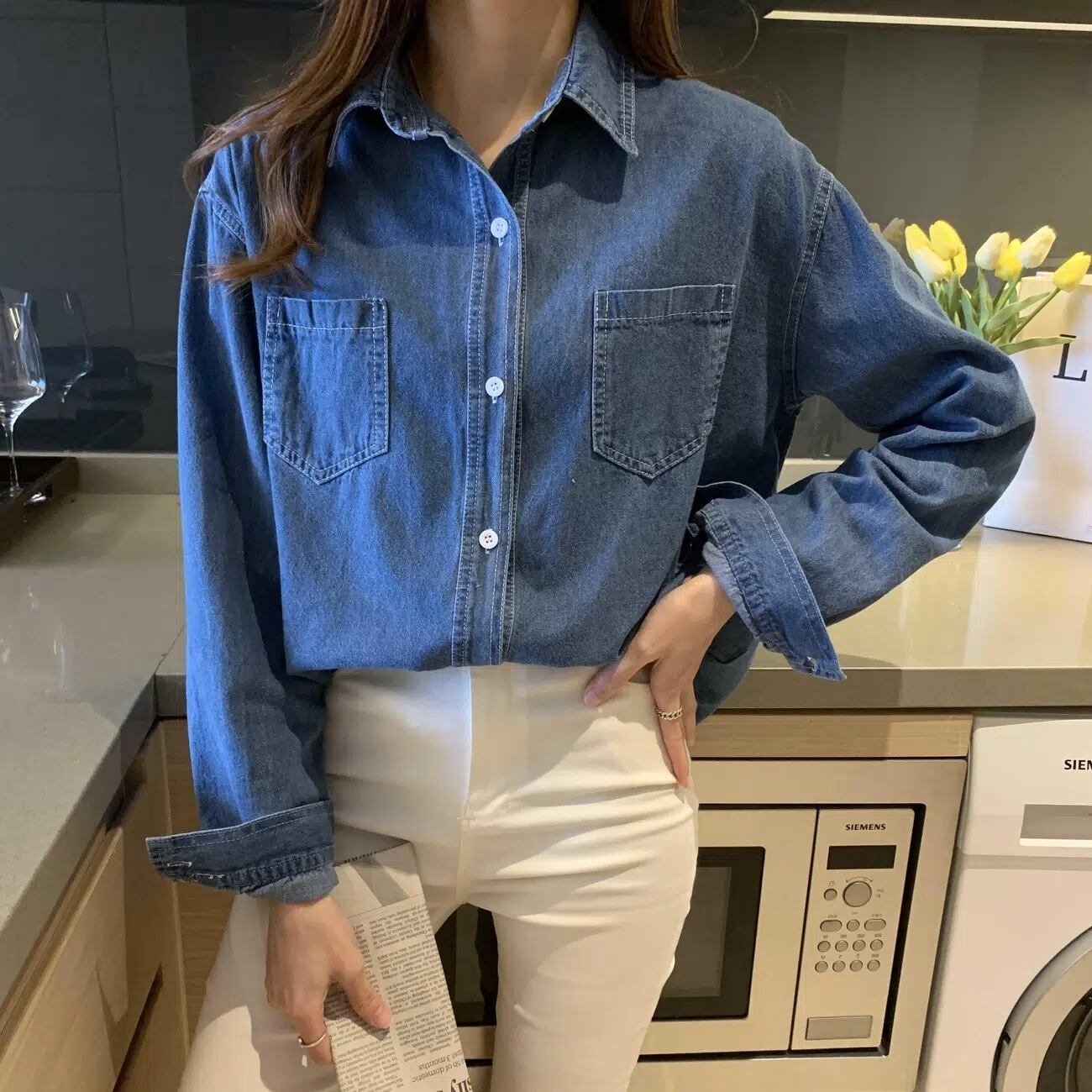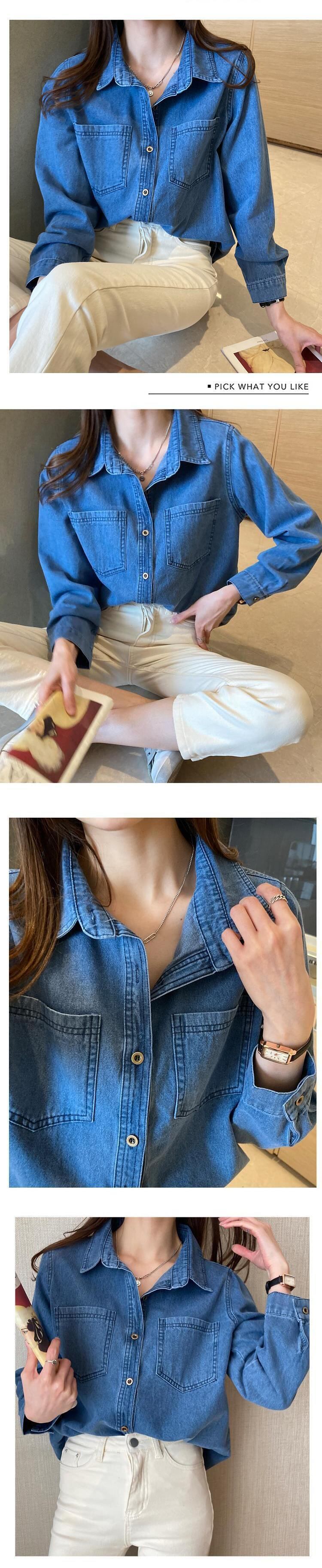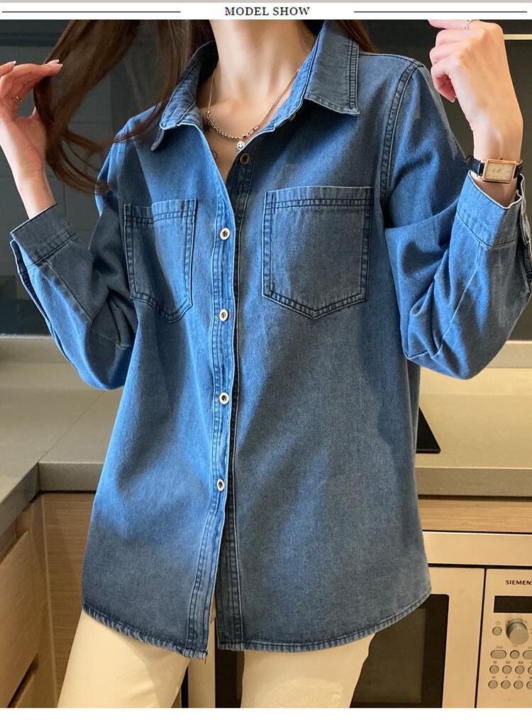 送料無料 ラペルデニムブラウス春秋クリックジャン女性のシャツベーシックポケットシングルブレストデモーダ 2022 トップス スプリング 春物 オータム 秋物 AE3356513724580900