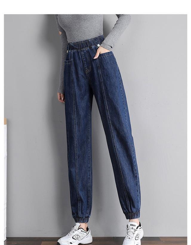 送料無料 弾性ウエストハーレムジーンズ女性ヴィンテージブルーベーシックポケットバンドバギーパンツボーイフレンドスタイル足首デニムズボン エラスティック 伸縮 ビンテージ AE3356527271501393