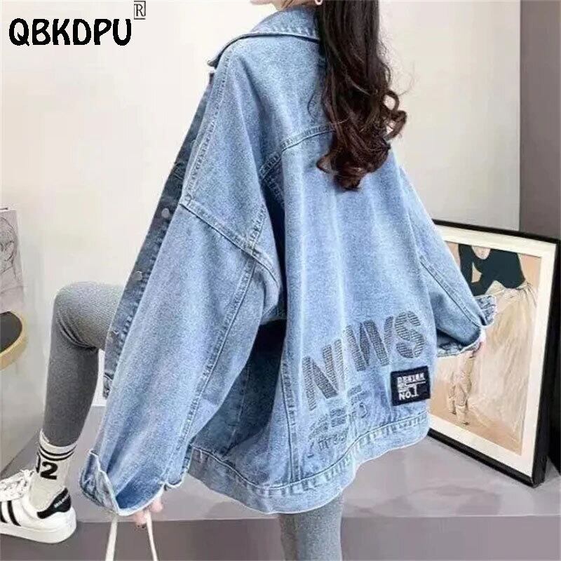 送料無料 女性特大デニムジャケット緩い 2022 春秋のジーンズジャケットパッチワークレターアウターベーシックブルーコートレディ スプリング 春物 オータム 秋物 AE335656919359792