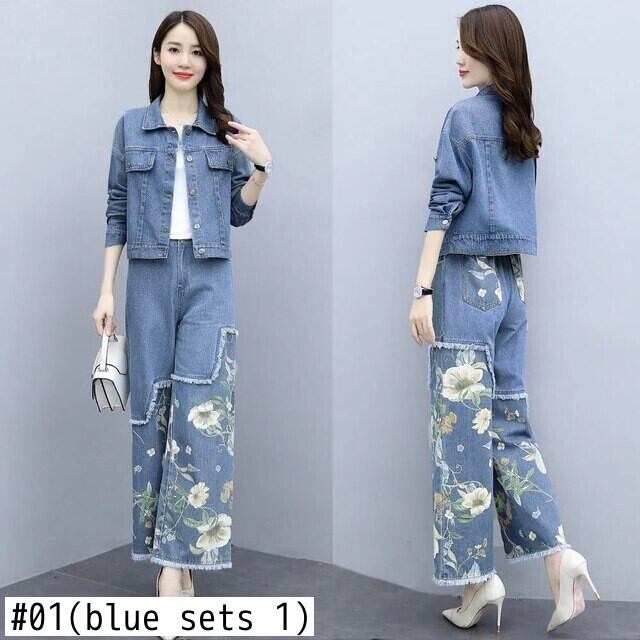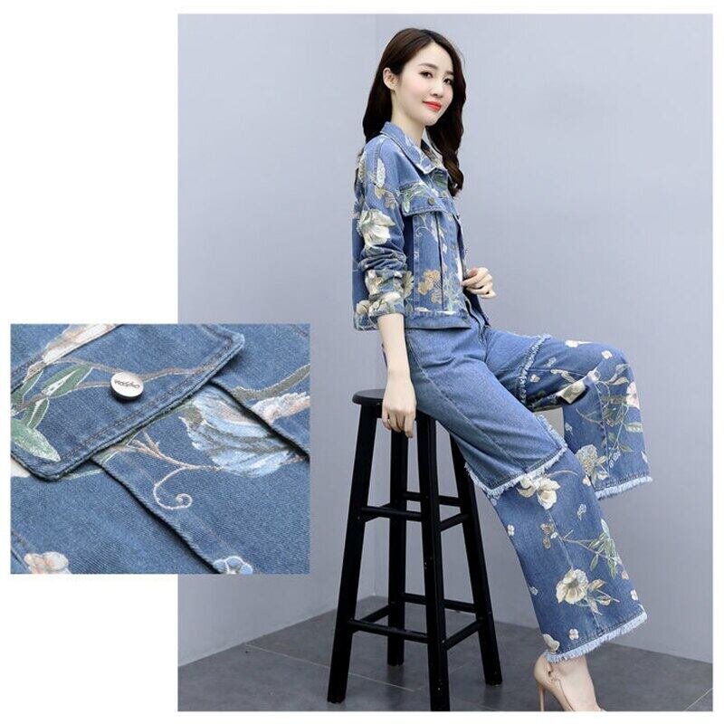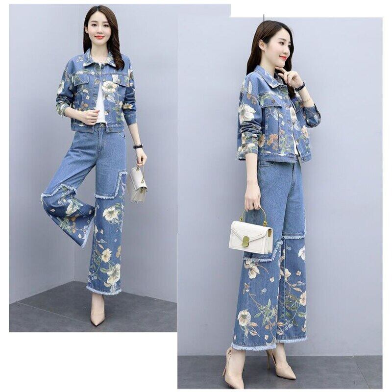 送料無料 ヴィンテージフラワープリントデニムツーピースセットシックな女性春クロップドジャケットワイドレッグパンツスーツママだぶだぶのジーンズ衣装 スプリング 春物 ワイドパンツ フラワーデザイン ビンテージ AE3356511505479523