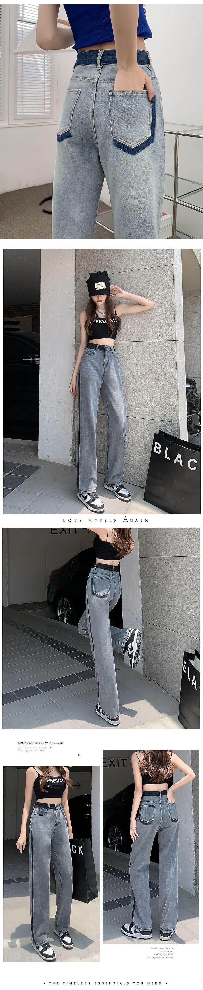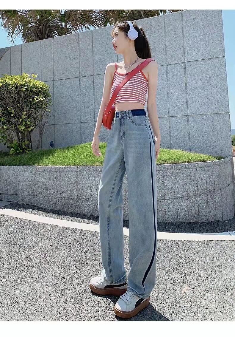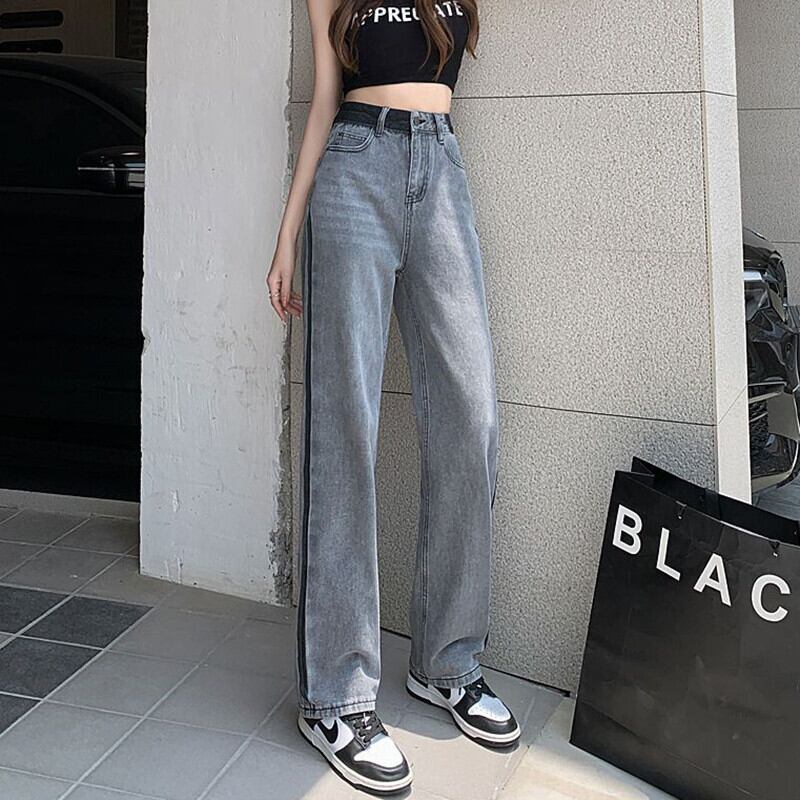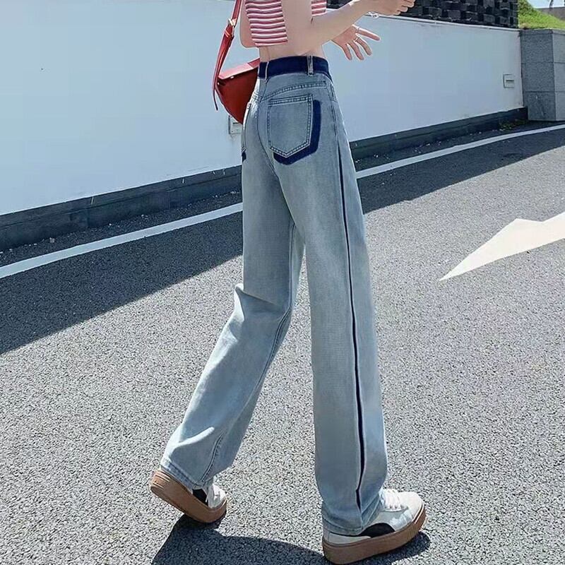 送料無料 ストリートコントラストカラーワイドレッグジーンズ女性ウエストウォッシュだぶだぶ Vaqueros 夏薄い漂白ストレートデニムパンツ サマー 夏物 ワイドパンツ AE3356537823854363