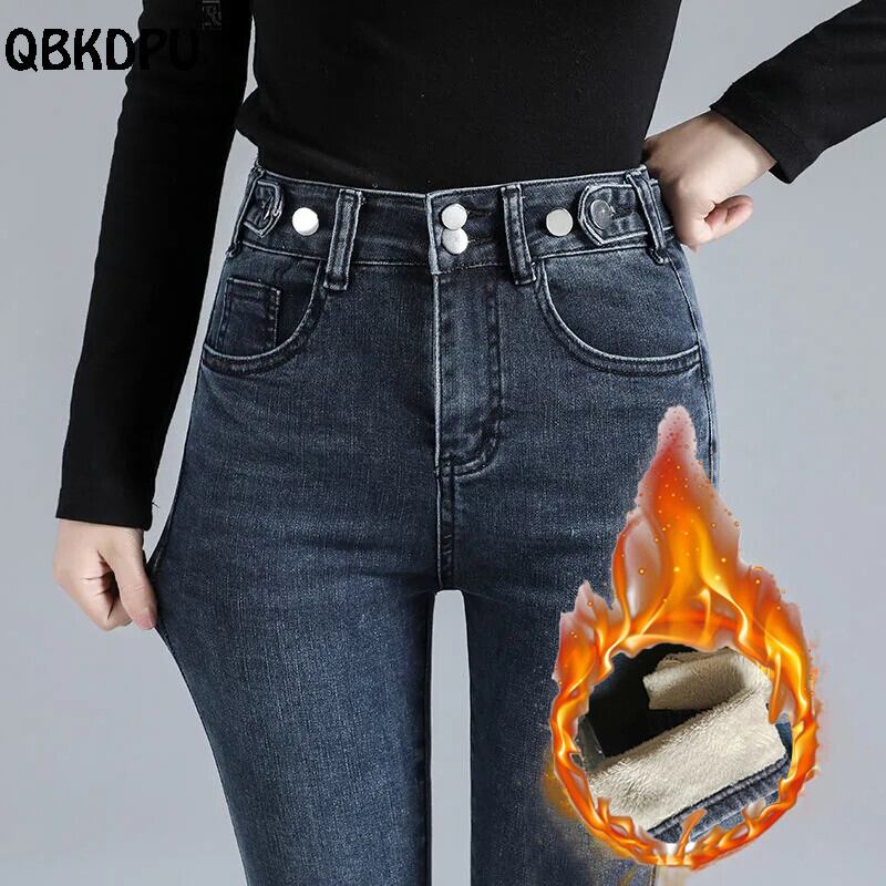 送料無料 スリムプラスベルベット冬のジーンズの女性ウエスト暖かいデニムスキニーパンツボタンストレッチカプリパンツ厚い足首 Vaqueros ウィンター 冬物 AE3356523284625705