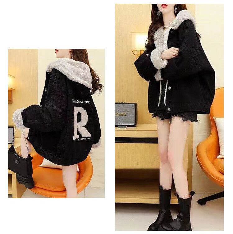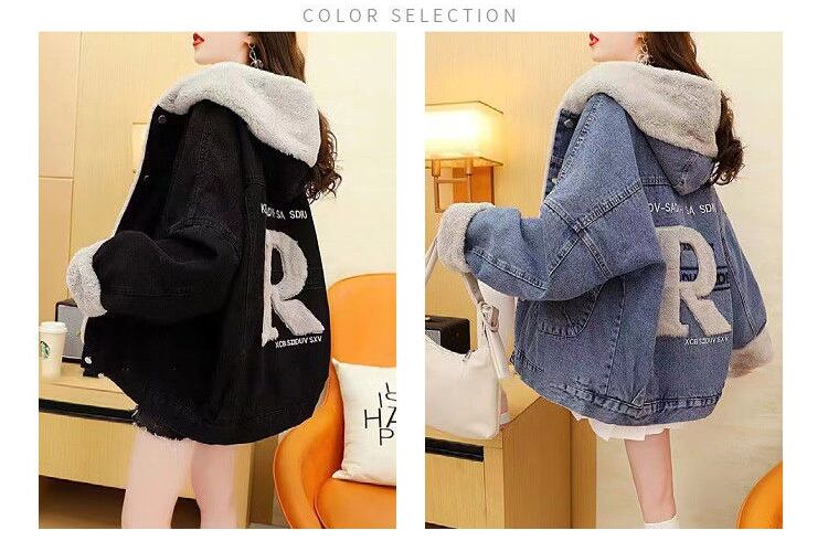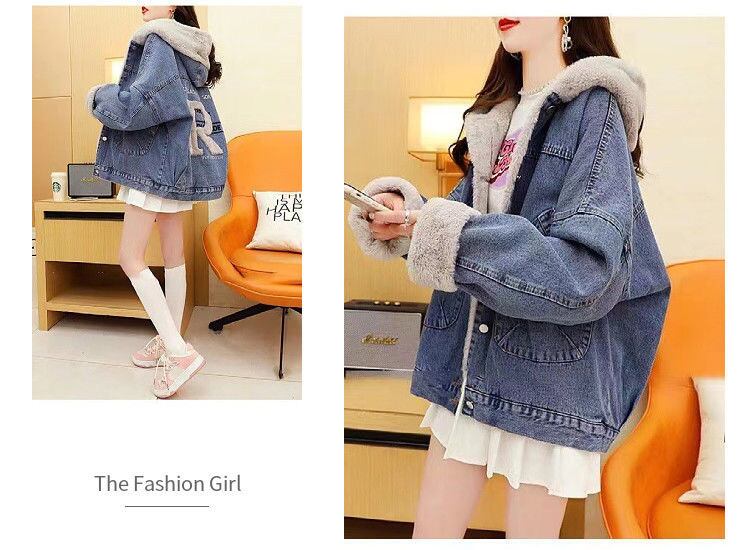 送料無料 冬の手紙フロッキングフード付きジーンズジャケット女性ルーズフリース裏地デニムコートプラスベルベット暖かい Jaqueta ジーンズ ウィンター 冬物 AE3356587110193493