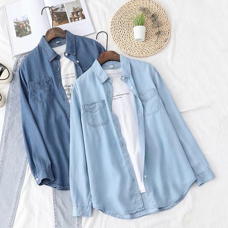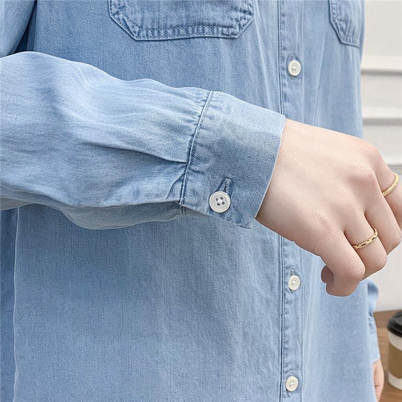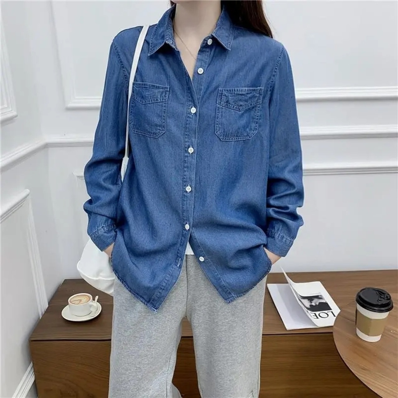 送料無料 レディース デニム ブラウス クリック シン コットン ジーンズ シャツ ターンダウン カラー ボタン ショート 無地 長袖 トップス ロング ソリッドカラー AE3356597567378242
