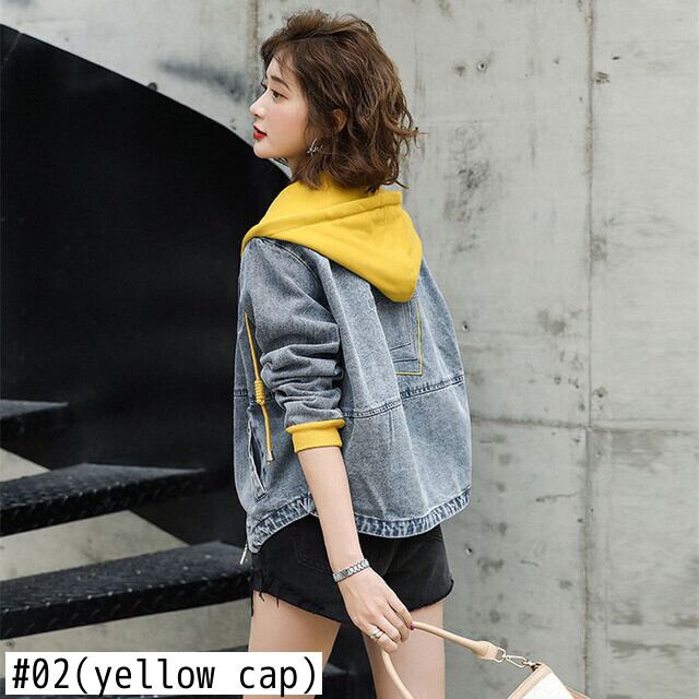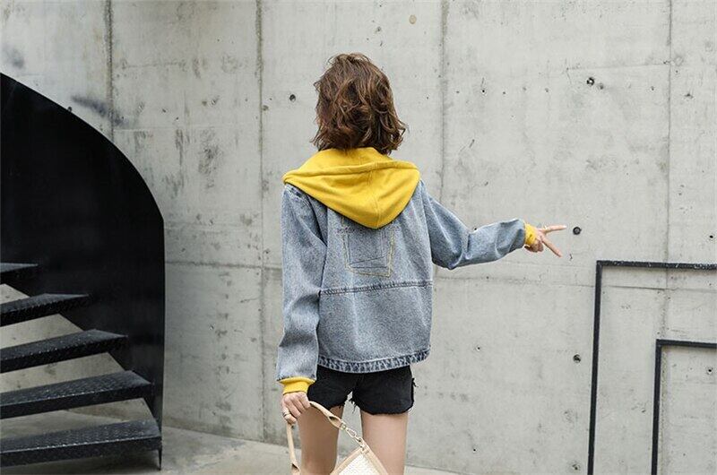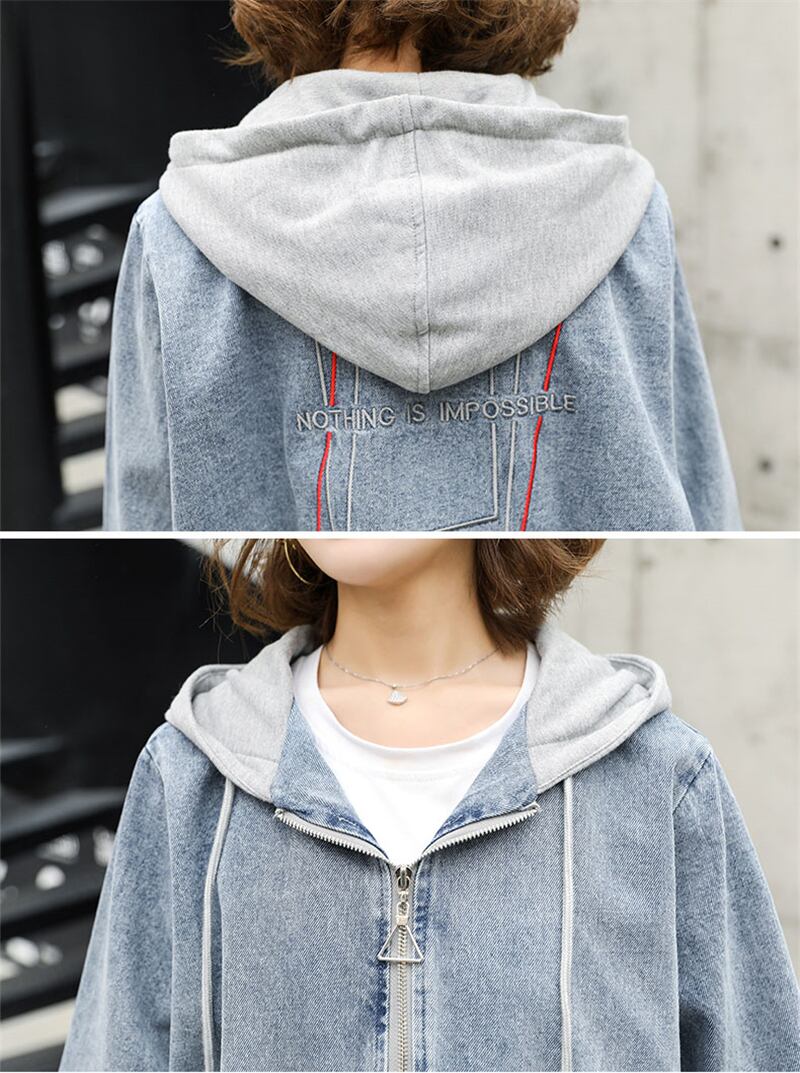 送料無料 ルーズパッチワークフード付きデニムジャケット女性刺繍ジッパージャンコートスタイル春ショートデニム生き抜くトップス スプリング 春物 AE3356576344731347