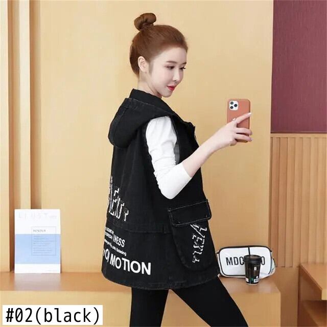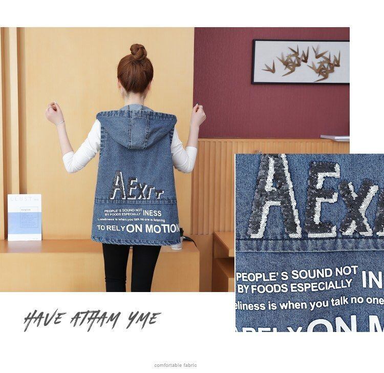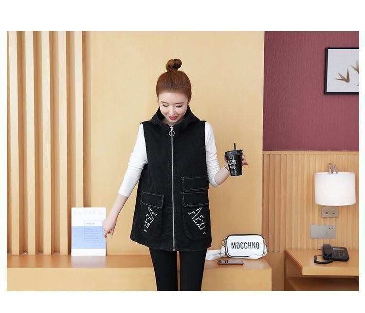 送料無料 プラスサイズポケットデニムベスト女性ミッドレングスルーズフード付きチョッキ手紙刺繍ジャンジャケット Chaleco 大きめサイズ AE3356537110618778