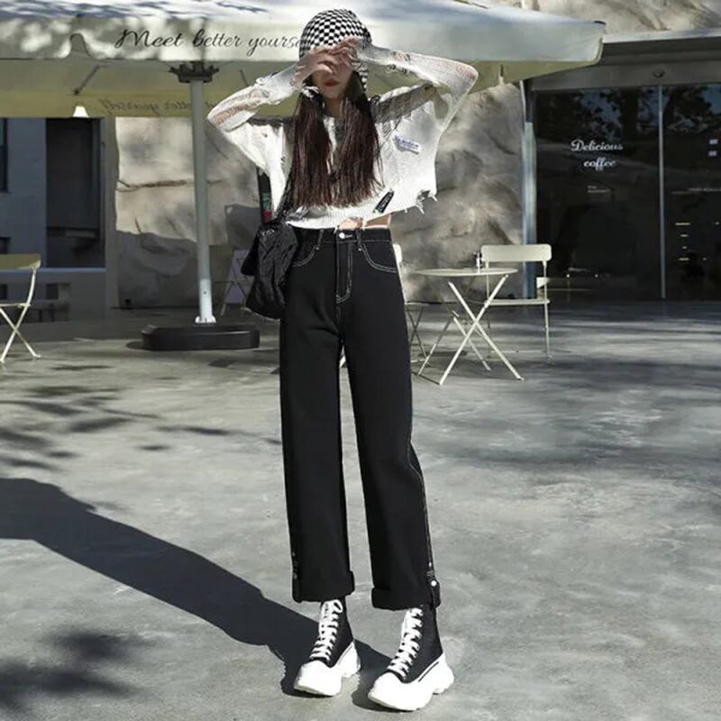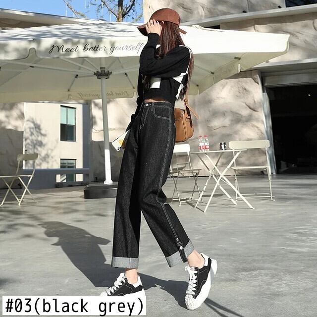 送料無料 ストリート足首丈ストレートだぶだぶのジーンズ女性ウエストカフ付きデニムパンツボーイフレンドスタイルワイドレッグ Vaqueros ワイドパンツ AE335656704022810