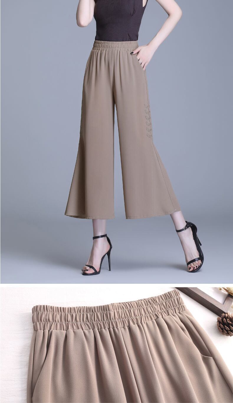送料無料 スプリットシフォンワイドレッグパンツ母の弾性ウエスト薄い夏 Pantalones 81-86 センチメートル足首黒バギーパンツ女性 ブラック エラスティック 伸縮 サマー 夏物 ワイドパンツ AE3356594093163825