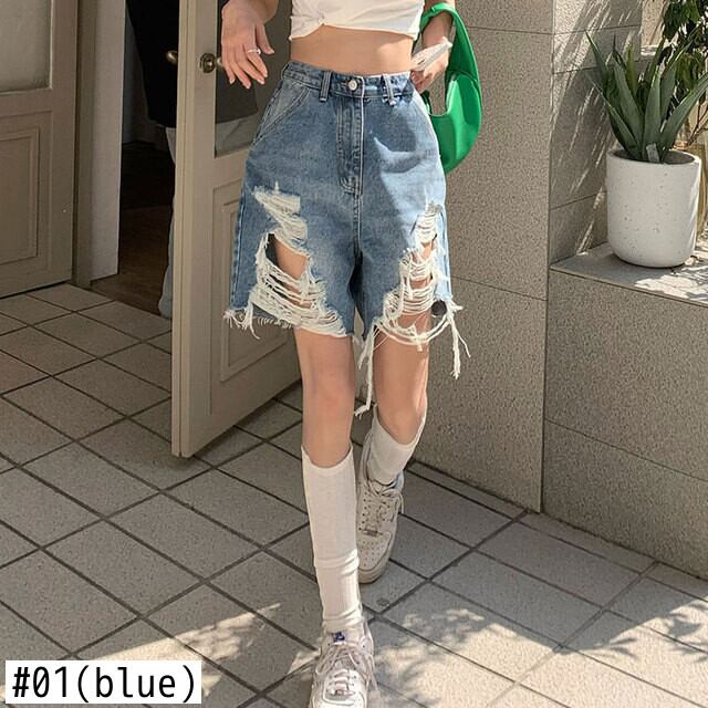 送料無料 ストリート膝丈リッピングジーンズ女性 2022 夏ブルーウエストデニムショーツストレート Vaqueros Cortos サマー 夏物 ブルマー AE3356534699954692