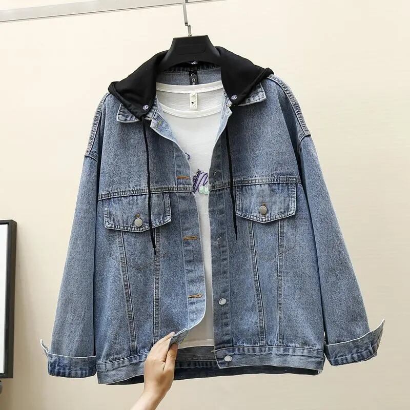 送料無料 手紙刺繍フード付きデニムジャケット女性ルース 85 キログラムプラスサイズデニム Chaquetas パッチワーク帽子ジャンジャケット 大きめサイズ AE3356582734793874