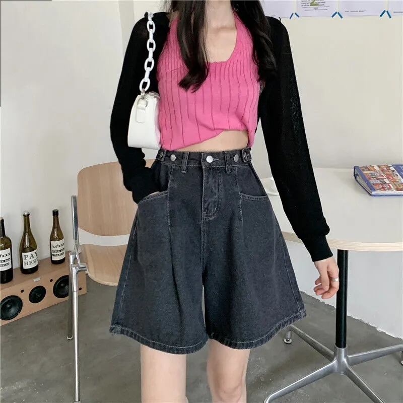送料無料 ストリート特大ショーツジーンズ弾性ウエストショートワイドレッグパンツ女性固体だぶだぶデニム Cortos エラスティック 伸縮 ブルマー ワイドパンツ ソリッドカラー AE3356584074633480