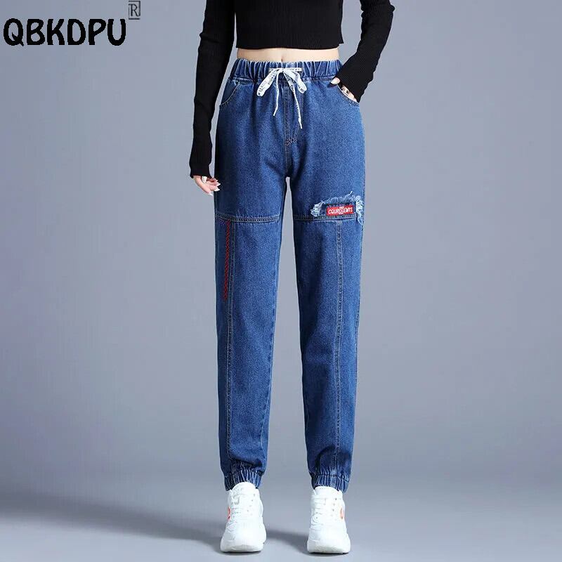送料無料 女性弾性ウエストジョガージーンズ擦り切れハーレム Vaqueros レースアップデニムズボン春夏足首までの長さのバンド付きパンツ エラスティック 伸縮 スプリング 春物 サマー 夏物 AE3356564643894173
