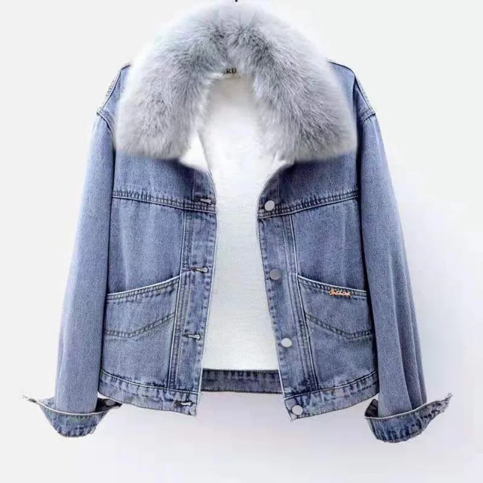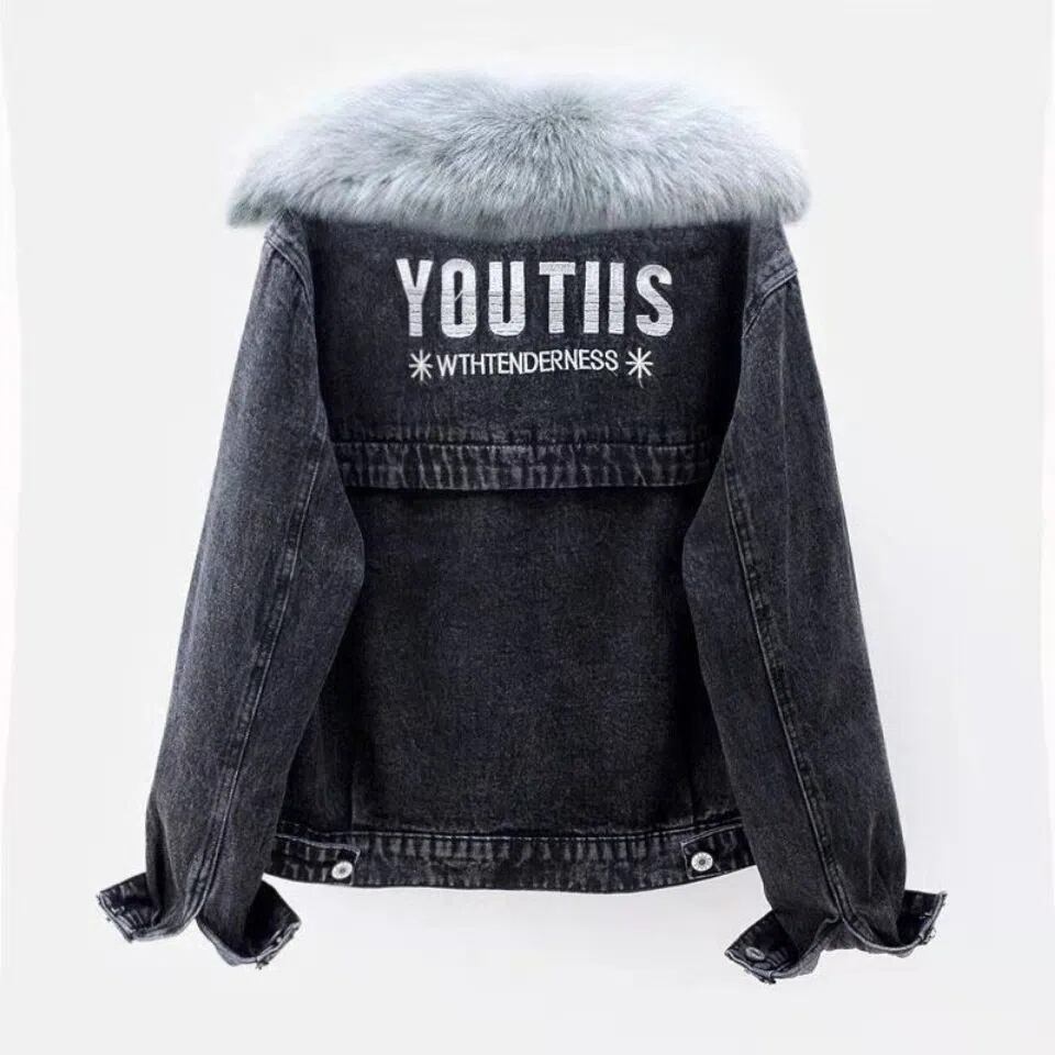 送料無料 ストリートフェイクファーの襟デニムジャケット女性刺繍フリース裏地冬のジーンズコート厚く暖かいジーンズ Veste ウィンター 冬物 AE3356516048357624