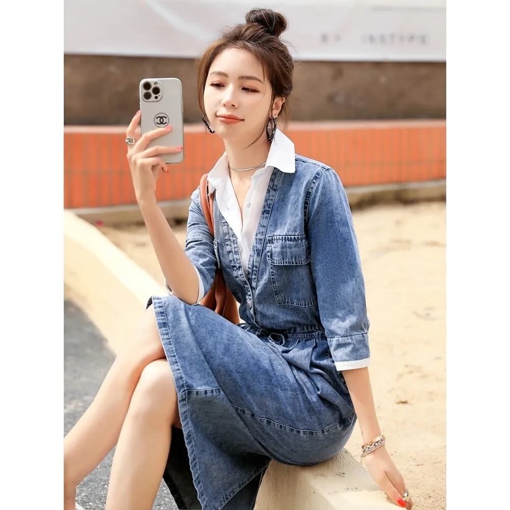 送料無料 偽 2 パッチワークシャツデニムドレスの女性の夏スリムウエストジャンドレスハーフスリーブミッドレングス Vestidos 半袖 サマー 夏物 AE3356524639817183 | 女性の為の通販サイト-fashion navi