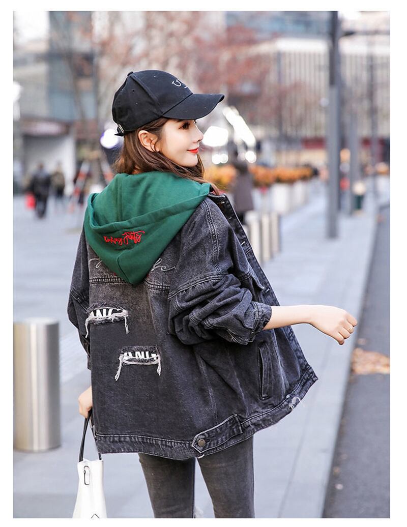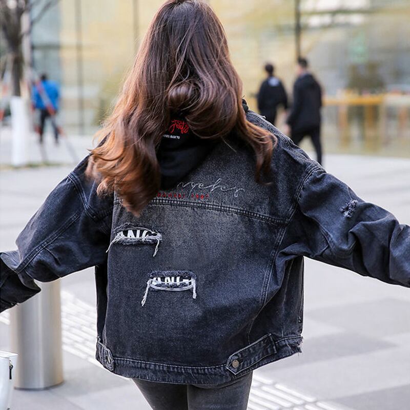送料無料 ヴィンテージ手紙刺繍ルースデニムフード付きジャケット女性ボーイフレンドリッピング黒ジャンコートストリート ブラック ビンテージ AE3356529424906671