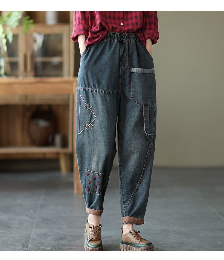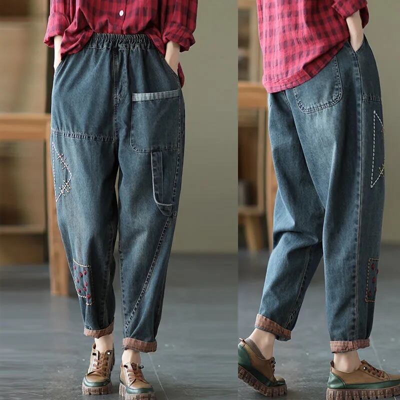 送料無料 刺繍ハーレムジーンズ女性足首緩いプラスサイズヴィンテージ Vaqueros ボーイフレンドスタイル弾性ウエストだぶだぶのデニムパンツ エラスティック 伸縮 大きめサイズ ビンテージ AE3356581618463136