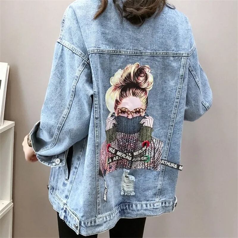 送料無料 プラスのサイズ 90 キログラム印刷デニム Chaquetas ストリート擦り切れルース女性のジーンズ ジャケット特大春ベスト 大きめサイズ スプリング 春物 AE3356518060461668