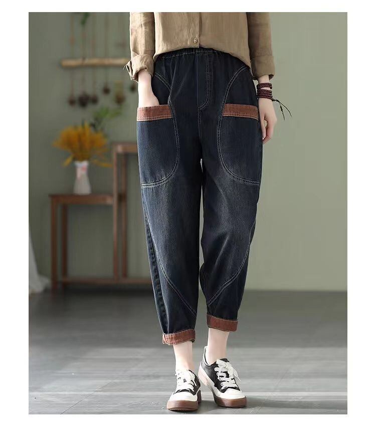 送料無料 女性のパッチワーク弾性ウエスト ヴィンテージ ジーンズ Bf スタイル ポケット プラス サイズ黒ハーレム パンツ ウエスト足首デニム ズボン ブラック エラスティック 伸縮 大きめサイズ ビンテージ AE335658661207931