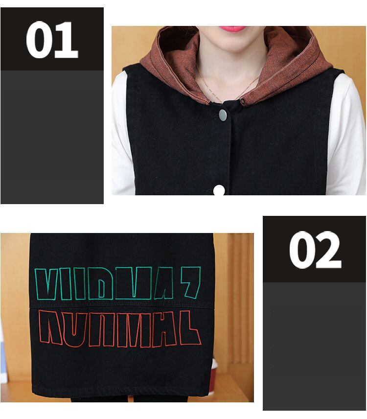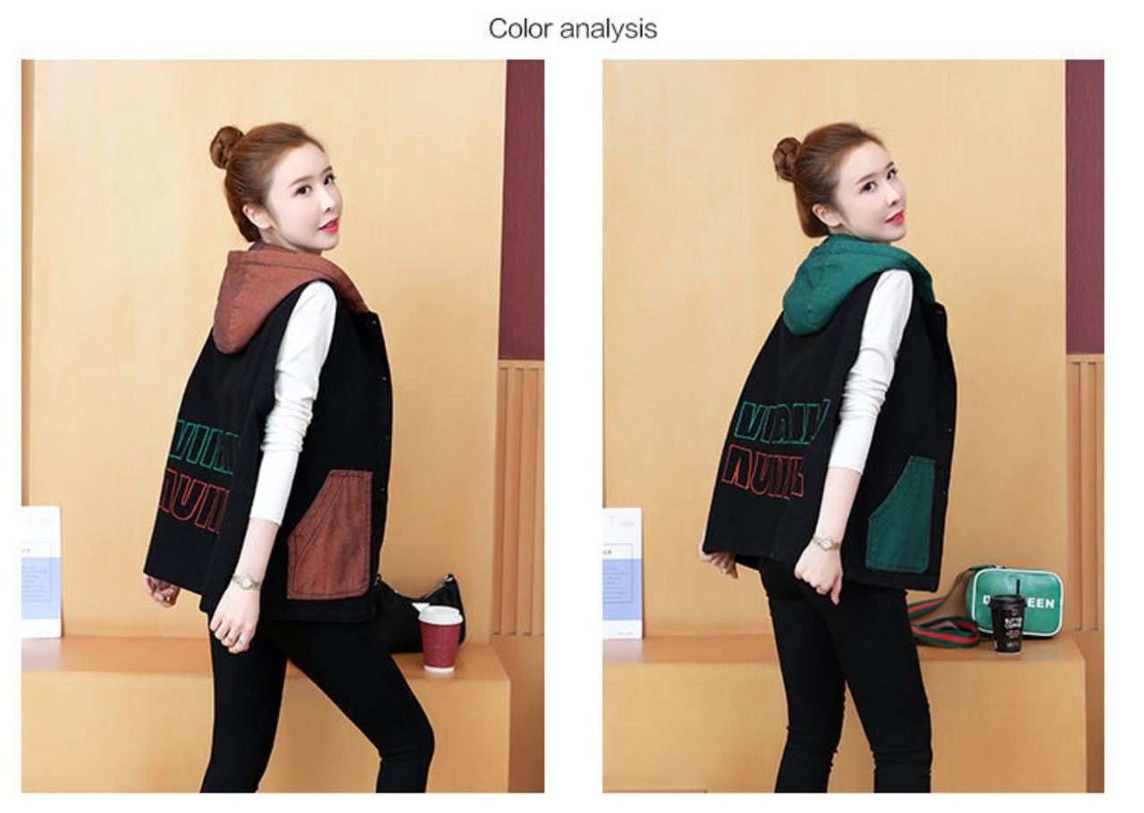 送料無料 プラスサイズのフード付きデニムベストジャケット女性緩い対照的な色 Chalecos ノースリーブポケット刺繍チョッキ 大きめサイズ AE3356598964079850
