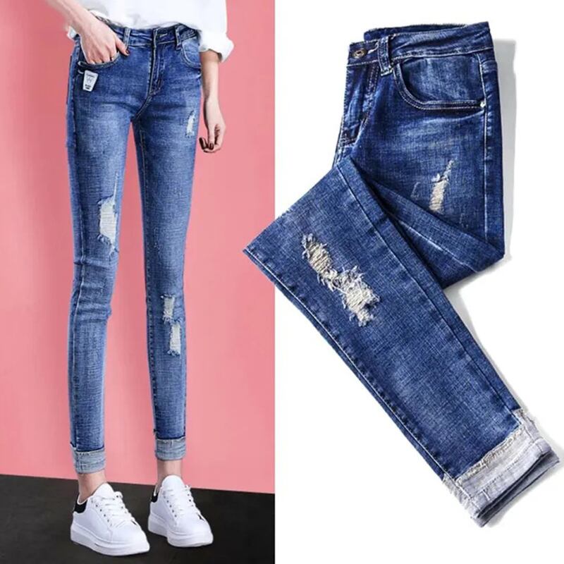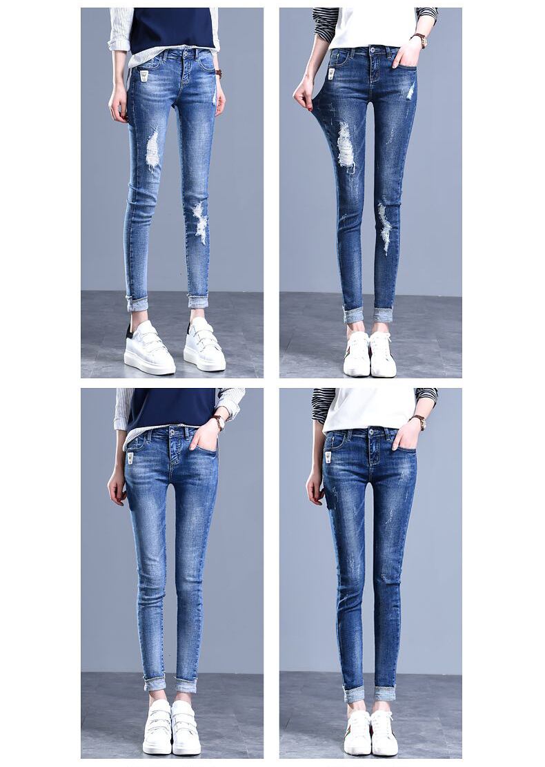送料無料 ストリート擦り切れストレッチジーンズ女性ミッドウエスト鉛筆 Vaqueros 女性スリムカウボーイスキニーパンツ足首丈デニムレギンス AE3356585990647190