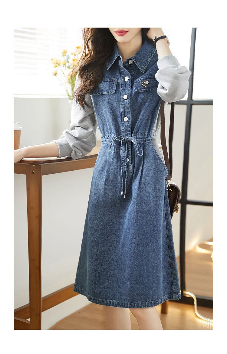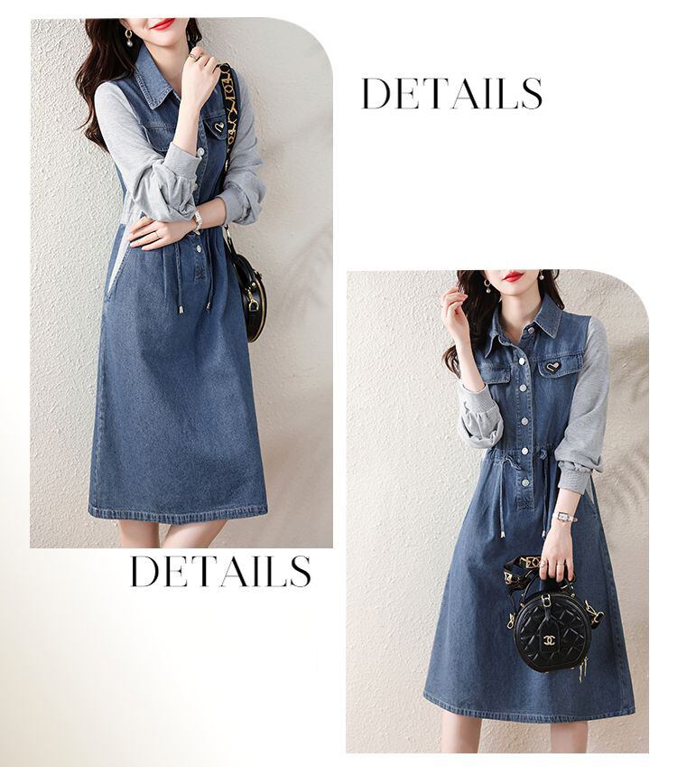 送料無料 パッチワーク デニム ドレス女性ミッドレングス春スリム ウエスト ジーンズ ドレス ラペル長袖ブルー Vestidos ロング スプリング 春物 AE3356594310832862