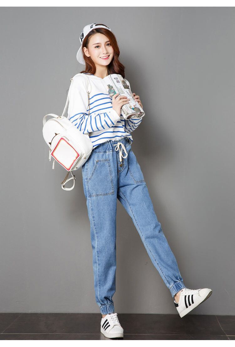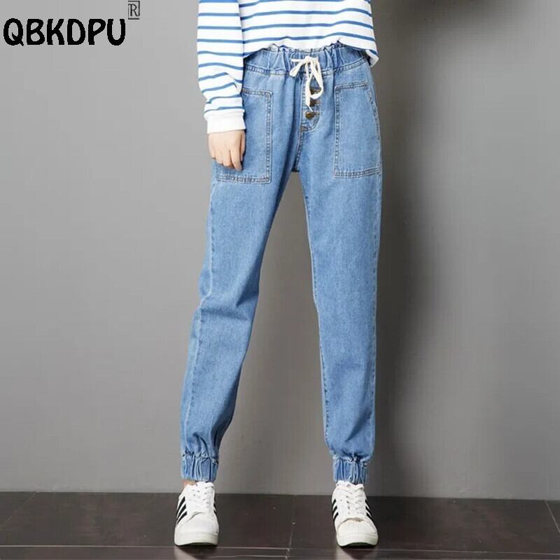 送料無料 ポケット巾着女性のジーンズ BF スタイル弾性ウエストバンドデニムパンツ足首丈ストリートだぶだぶ Vaqueros エラスティック 伸縮 AE3356540093332335