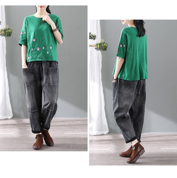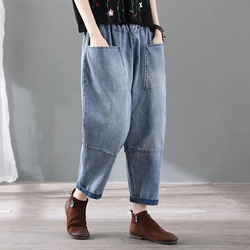 送料無料 ストリート bf スタイルだぶだぶのジーンズ女性ビッグポケット弾性ウエストハーレム vaqueros 漂白アンクル丈デニムパンツ エラスティック 伸縮 AE3356518684624643