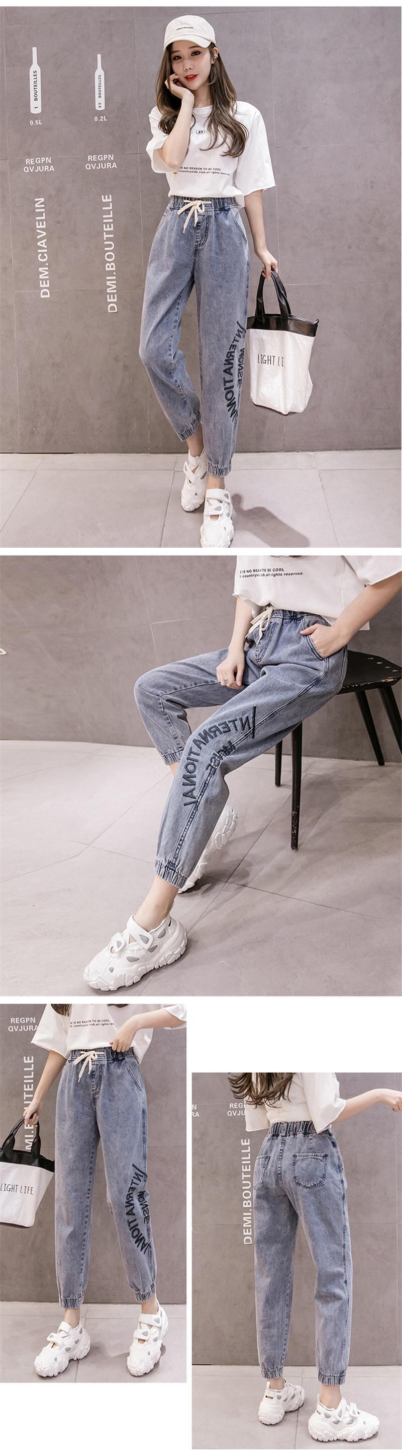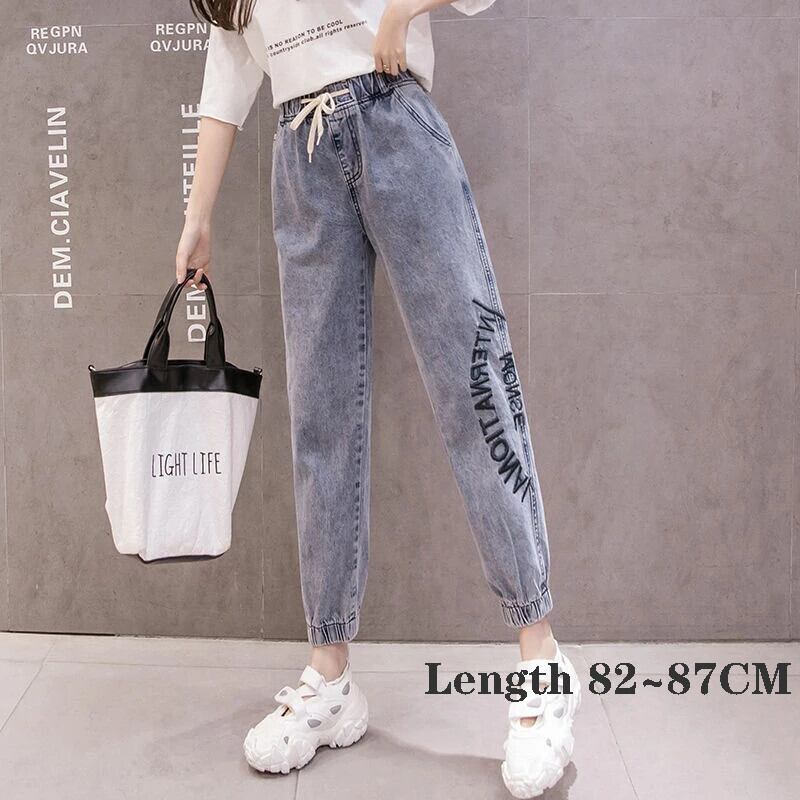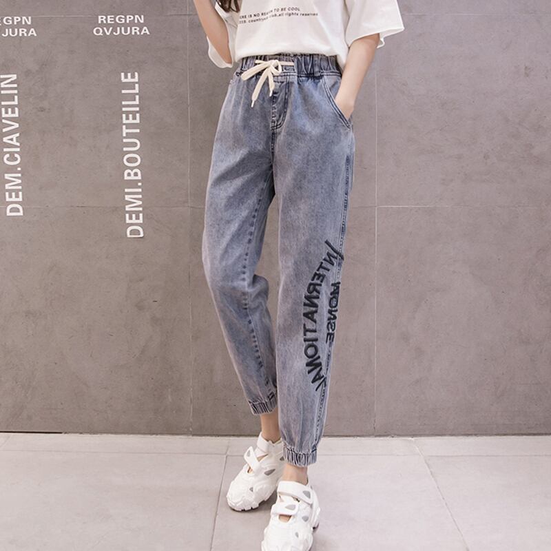 送料無料 弾性ウエストバンドジーンズ女性ストリート巾着ハーレムデニムパンツ手紙刺繍春ブルー Vaqueros エラスティック 伸縮 スプリング 春物 AE3356533918271965