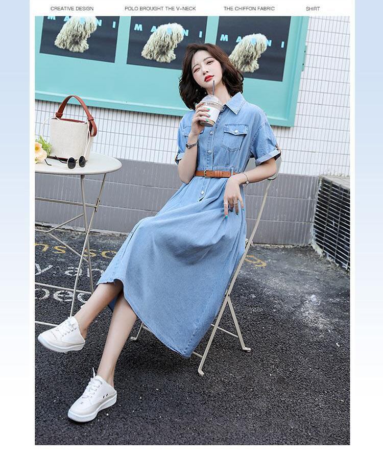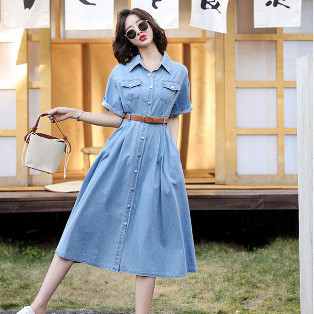 送料無料 ベルトロングデニムドレス女性 2023 夏ラペルシングルブレストジーンズドレスブルー半袖薄型スリム Vestidos ショート ハーフスリーブ サマー 夏物 ハーネス AE3356511933839970