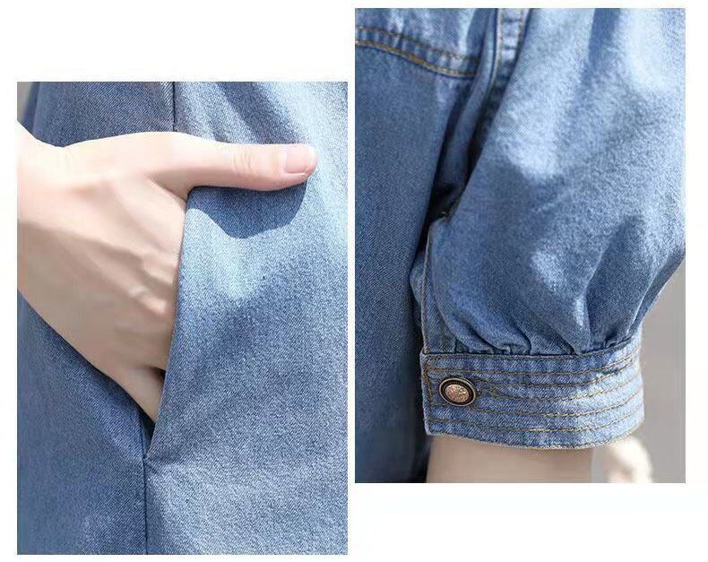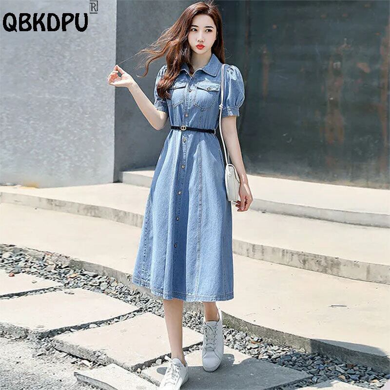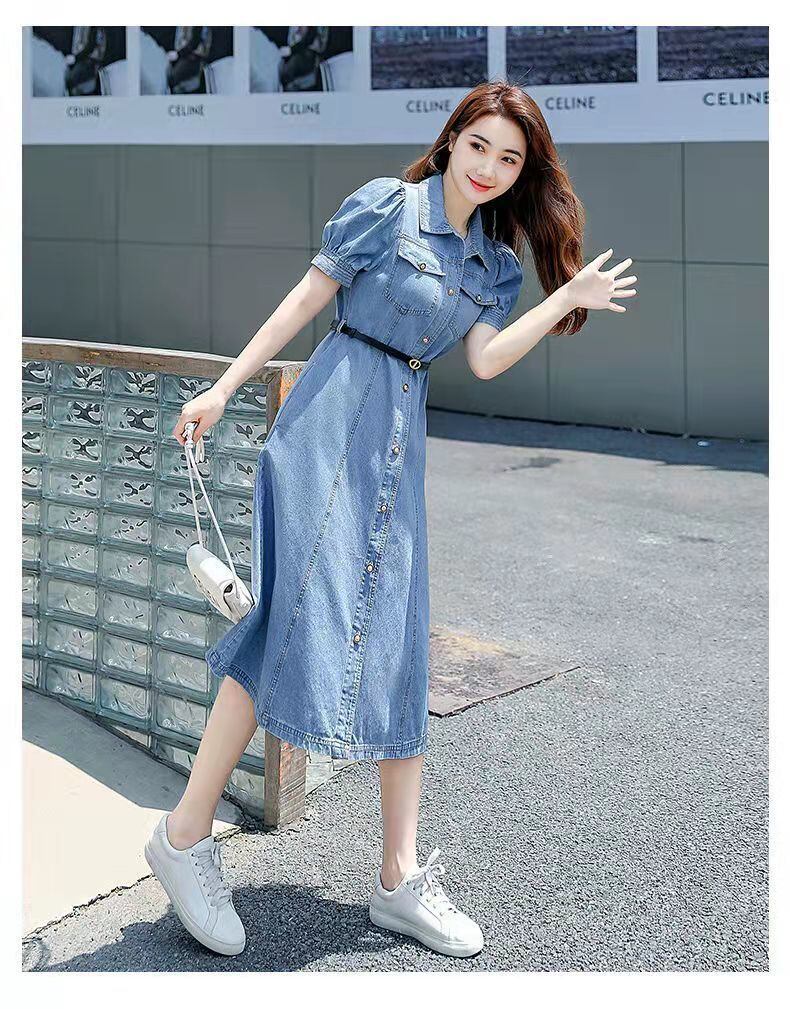 送料無料 フレンチスタイル半袖デニムドレス 2023 夏スリムウエストベルトジーンズドレス女性ヴィンテージブルーミッドレングス Vestidos ショート ハーフスリーブ サマー 夏物 ハーネス ビンテージ AE3356551767203847