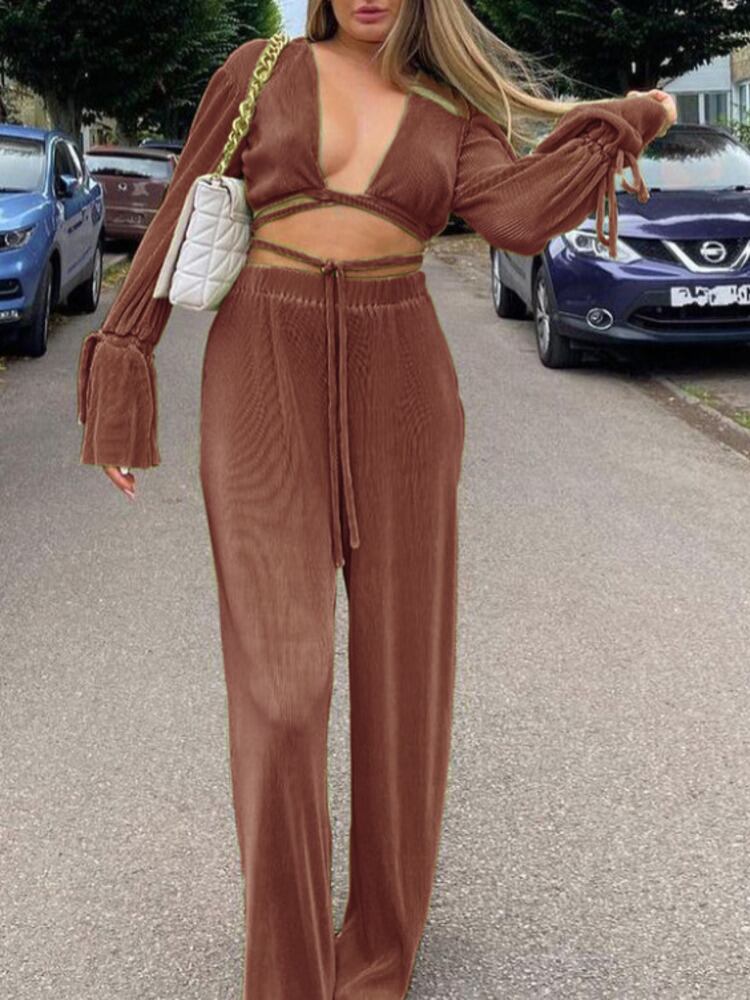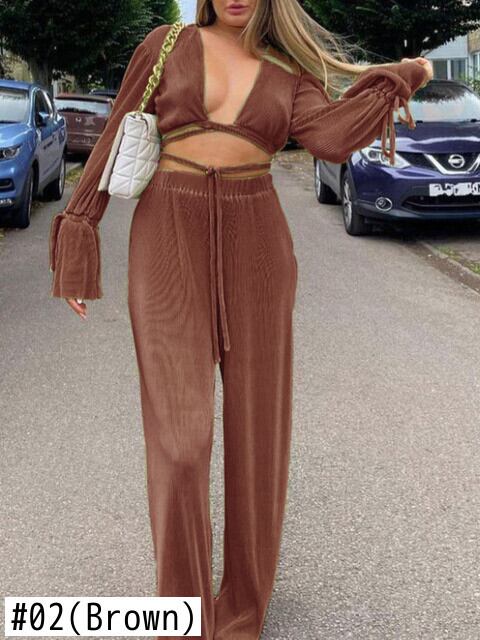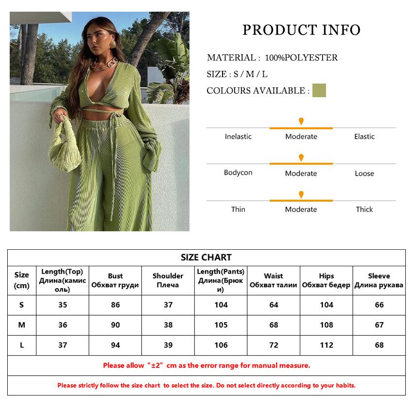 送料無料 Mozision プリーツ ツーピース セット レディース フレア スリーブ クロップ トップとロング パンツ セット ズボン スーツ フレアスリーブ AE121288818756895372