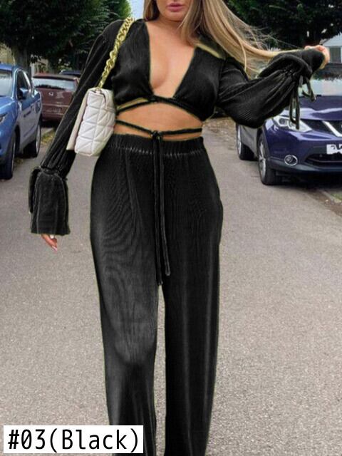 送料無料 Mozision プリーツ ツーピース セット レディース フレア スリーブ クロップ トップとロング パンツ セット ズボン スーツ フレアスリーブ AE121288818756895372 | 女性の為の通販サイト-fashion navi